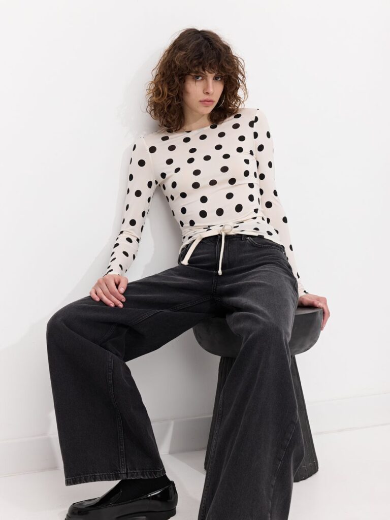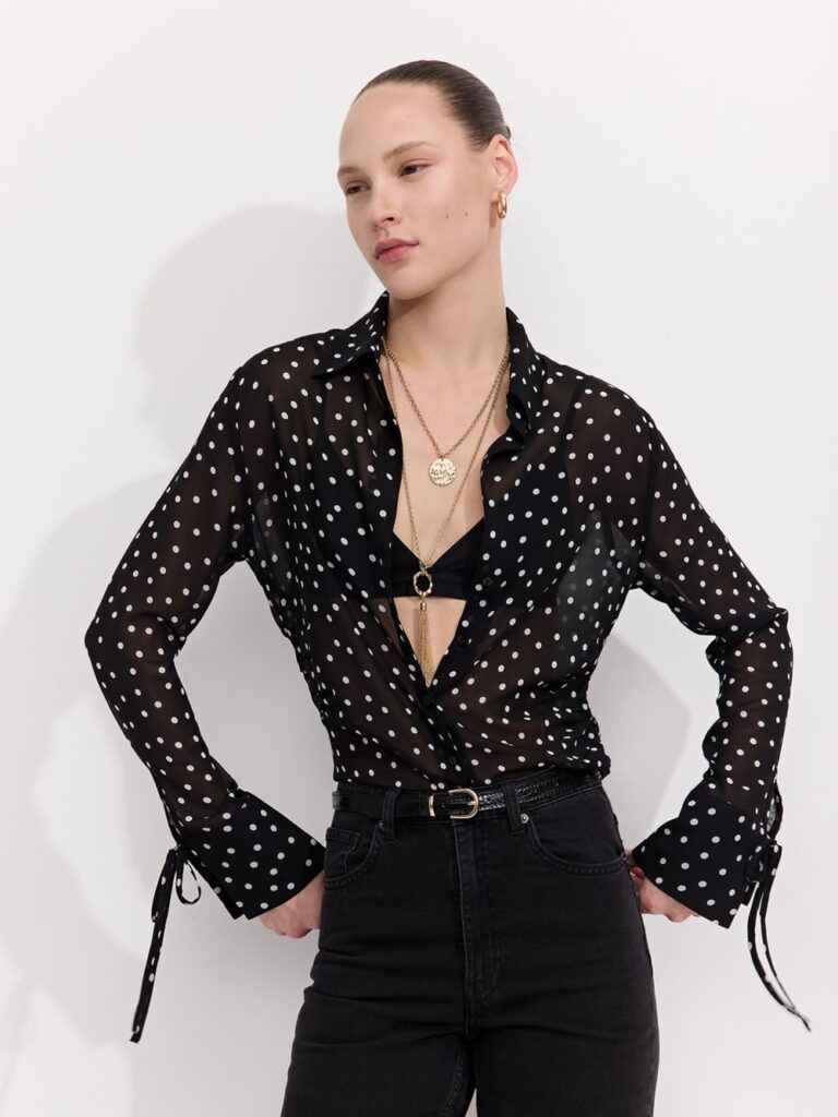 אם את מחפשת את השילוב המדויק בין רומנטיקה לתחכום, כדאי שתשימי לב למשחקי השקיפויות העדינים והדפסי הנקודות שמוסיפים קריצה נשית ורכה לכל לוק.
