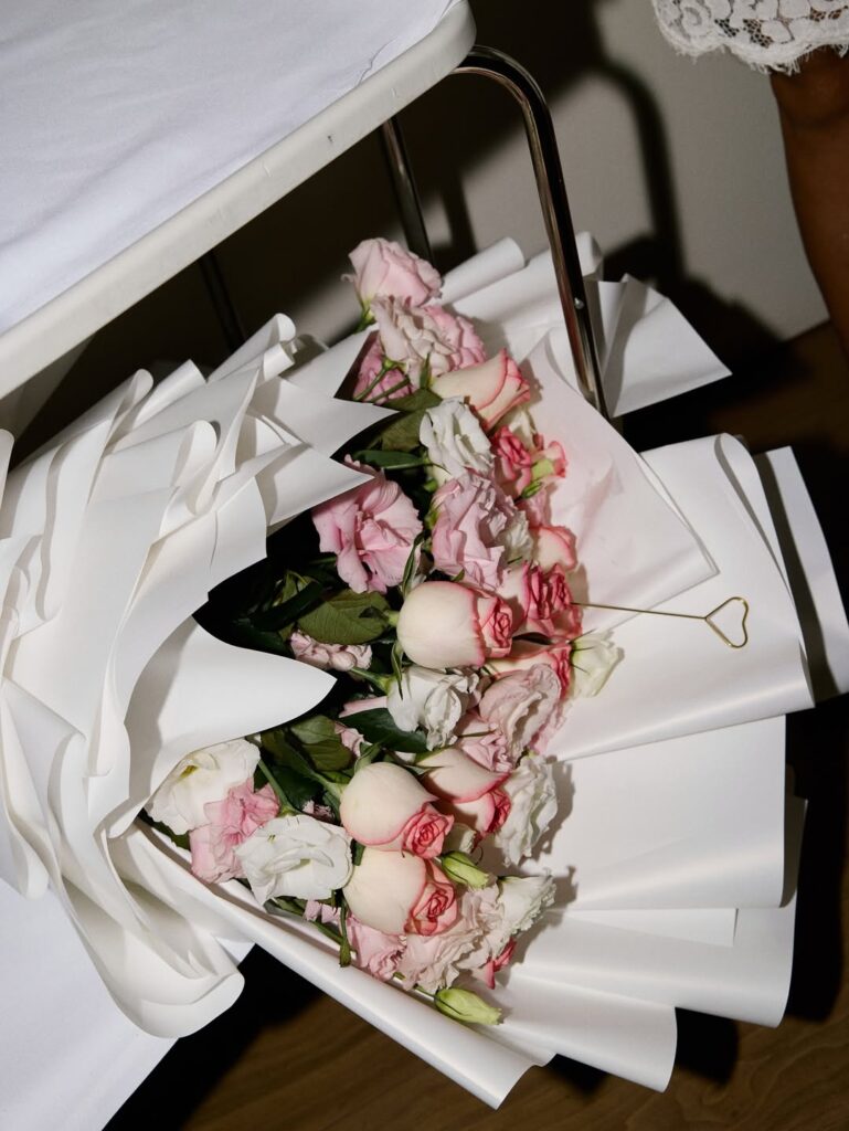 על ראשה, אתי אספה את שיערה לגולגול מהודק והוסיפה פיסת בד סאטן לבנה שנקשרה כפרח גדול. אלמנט זה מקשר בצורה מושלמת לקישוט התלת-ממדי שעל החזה ומעניק נופך פואטי ואלגנטי למראה הכללי.