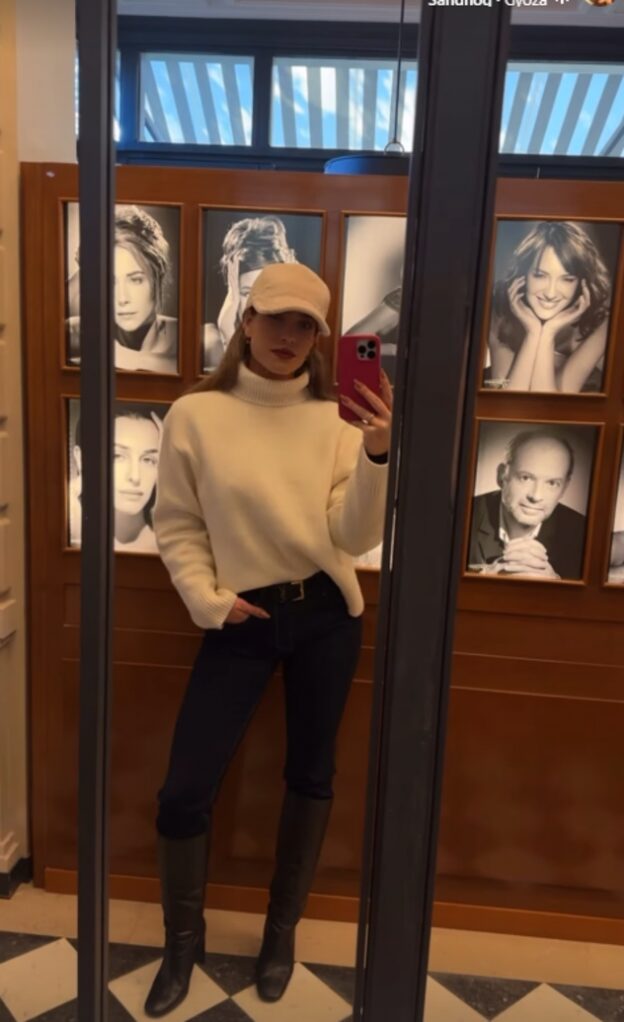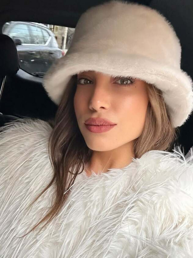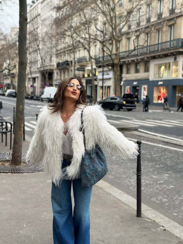 הלוק הראשון של דניאל גרינברג הוא מהסוג שגורם מיד לרצות מעיל פרווה אוברסייז כזה בארון. היא שילבה אותו בחופשה עם ג’ינס בייסיק בגוון תכלת ותיק ג’ינס ויוצרת מראה יומיומי עם טוויסט חורפי־יוקרתי. חגורה של סן לורן מוסיפה דיוק אופנתי, משקפי שמש של שאנל מעניקים קריצה פריזאית וכובע קסקט.