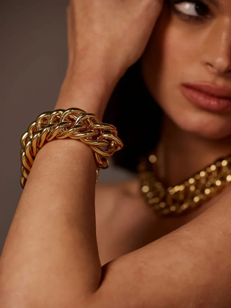 תכשיטי ענק ממשיכים לשלוט בזירת האופנה גם ב-2025, כשהם הופכים להצהרה אופנתית בפני עצמם. עגילי הטיפה של בוטגה ונטה התחילו את המגמה הזו עוד בתחילת השנה, וצמידים קשיחים (bangles) הפכו להיות פריט חובה שאי אפשר לפספס ברשת. שרשראות גדולות ומסיביות מצטרפות גם הן לרשימה, עם טרנד חרוזי הזכוכית הענקיים או חוליות גדולות כמו השרשראות של ז’אקמוס.