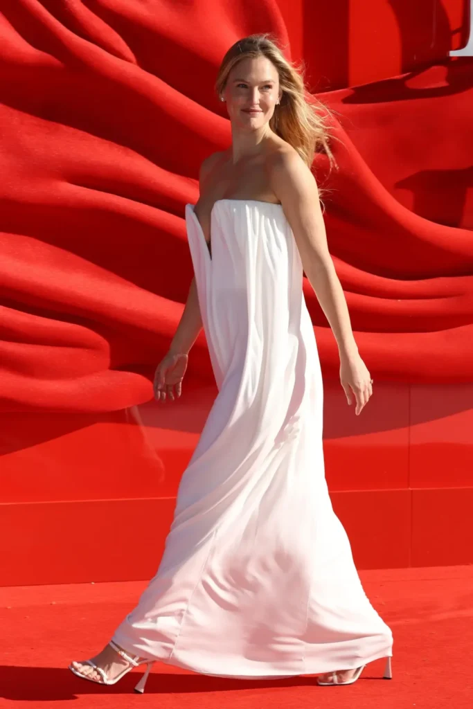 בין הבזקי הפלאשים של הכוכבות הראשיות, מריל סטריפ ואן האת’ווי, בר בלטה בזכות לוק לבן ומינימליסטי בעיצובה של סטלה מקרטני. מדובר בשמלת סטרפלס בגוון נקי שנשפכה על הגוף בגזרה תנועתית ומשוחררת, עם מחשוף צר ועמוק שיצר קפלים עדינים ורכים. הבחירה הזו התחברה בדיוק לאסתטיקה המזוהה עם רפאלי – סטייל לא מתאמץ שמשדר יוקרה שקטה, כזה ששם דגש על נוחות מתוחכמת וקווים עכשוויים מאוד.