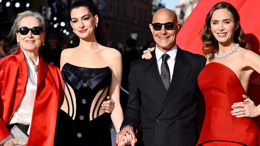 הקו הנקי המשיך גם לנעליים, שם נרשמה בחירה בסנדלי עקב עם אבזמי זהב קטנים וגם לגזרת הגלאם. יוני שיין היה אמון על איפור בטאץ’ כמעט בלתי מורגש והשיער הבלונדיני הושאר פזור וטבעי ללא תכשיטים מסיביים שהיו עלולים להכביד על המראה ולצד דמויות כמו ניקי הילטון וקיארה פראני וקאסט שכלל את אמילי בלאנט וסטנלי טוצ’י.