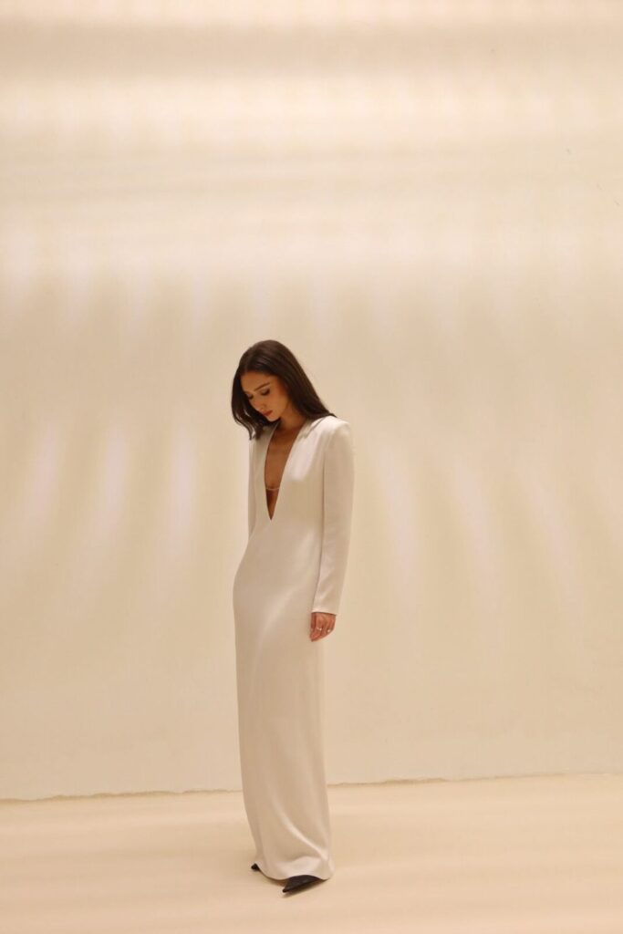 הדגם החדש הוא בעצם גלביה, אבל כזו שקיבלה טיפול מאוד נשי עם מחשוף עמוק שאי אפשר לפספס. השוס האמיתי כאן הוא השרשרת הכסופה שרקומה ישירות לתוך השמלה – פריט מתוך מותג התכשיטים שלה, Studio Sea Collection. זה בדיוק החיבור שחיפשו שם, בין השפה העיצובית של שירה למורשת של משכית, וזה יוצר מין “דרמה שקטה” כזו שעוברת מצוין גם בתוך סלון ביתי.