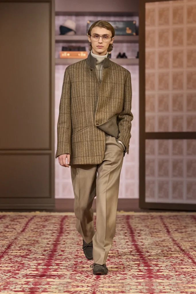 מדובר אומנם בגזרה יחסית קלאסית- אנחנו רגילים לראות צווארון סיני בחולצות מכופתרות, אבל החלחול של הטרנד לג’קטים מחוייטים יוצר עניין מחודש. קו מקשר נוסף בין הז’קטים המוצגים הם הבדים שמהם הם עשויים, הפלטה הצבעונית שלהם ניטרלית למשלבת הדפסים קלאסיים.