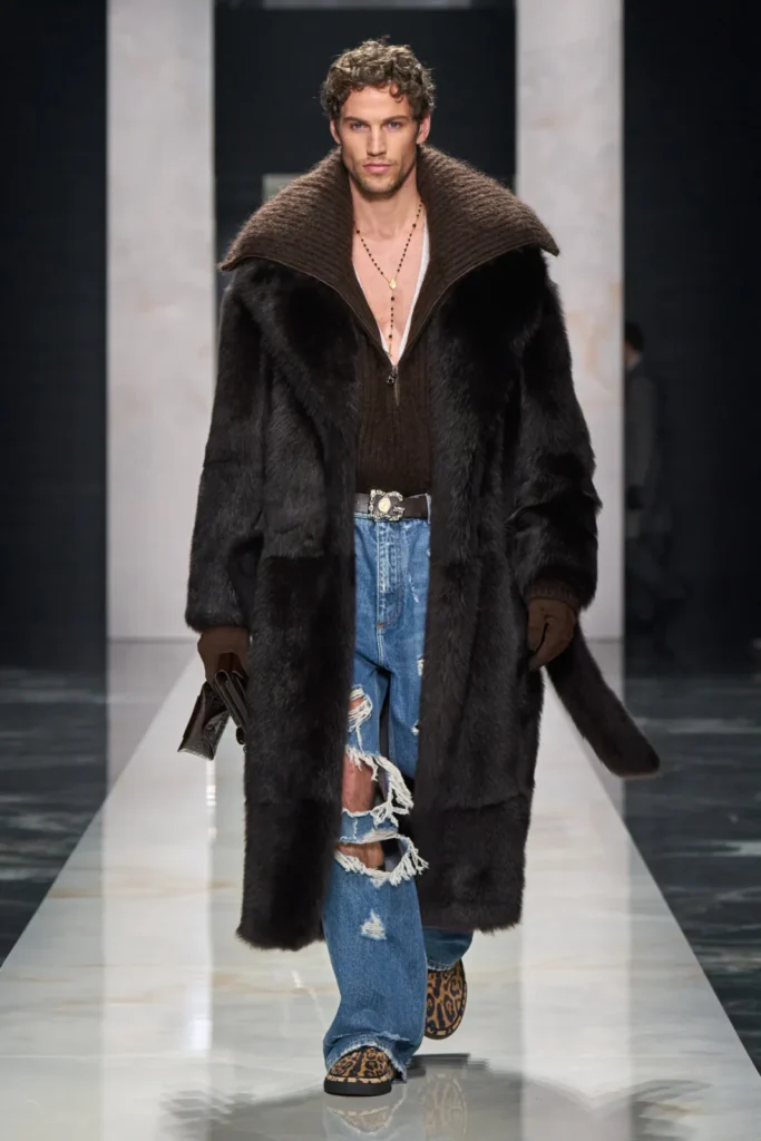 מעל הנעליים הסגורות שלהם הם הוסיפו עוד שכבה חצי מחוברת שיוצרת מעין “כנפיים” לנעל ויוצרת אשליה אופטית של כף רגל ענקית, ביג פוט היה שמח. דולצ’ה וגבאנה הציגו לוק עם סוודר חום שיש לו צווארון עצום, כה עצום שהוא עובר את קו הכתפיים, אותו שילבו עם ג’ינס ומעיל פרווה שגם הוא חום.
