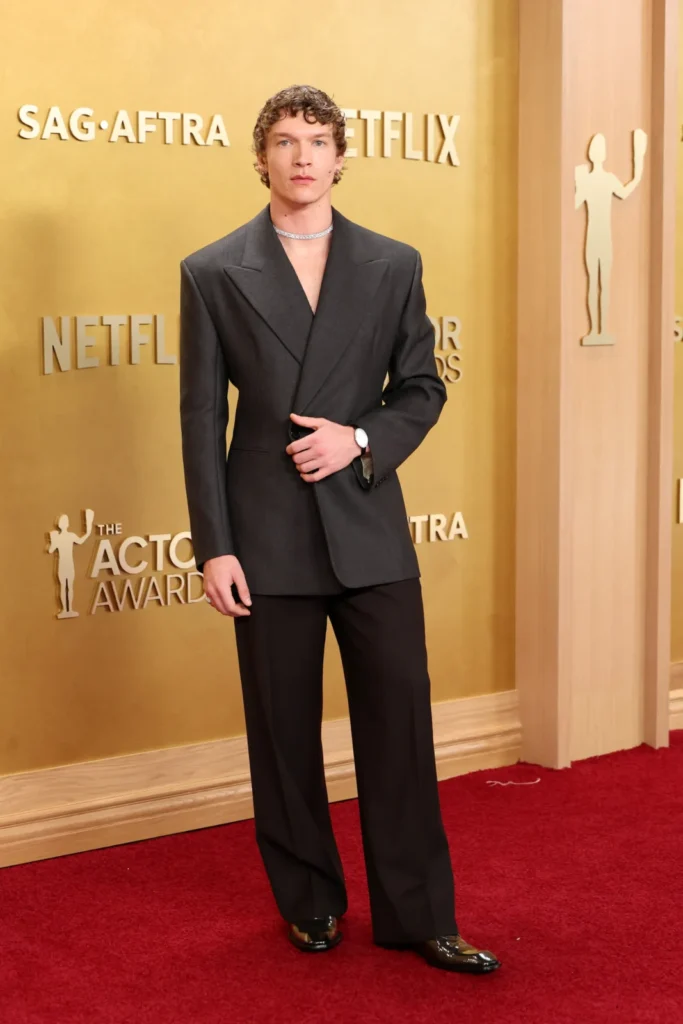 ניקולס גאליצין הכוכב העולה בחר במראה נועז ובלתי קונבנציונלי מבית איב סן לורן. הוא לבש בלייזר אפור כהה בעל דשים רחבים שנלבש ללא חולצה מתחת מה שחשף שרשרת יהלומים צמודה לצוואר– אביזר שהיה נפוץ בקרב נשות החברה הגבוהה בשנות ה-20 וכאן קיבל היפוך מגדרי מרתק.