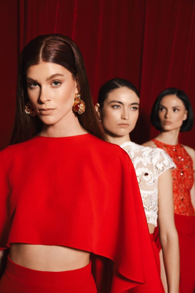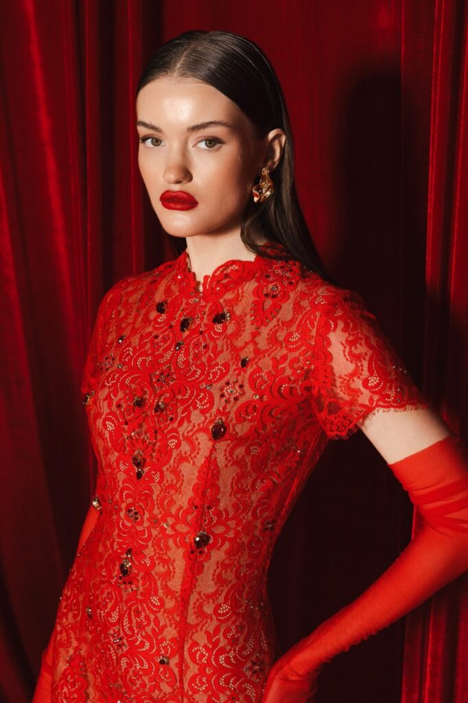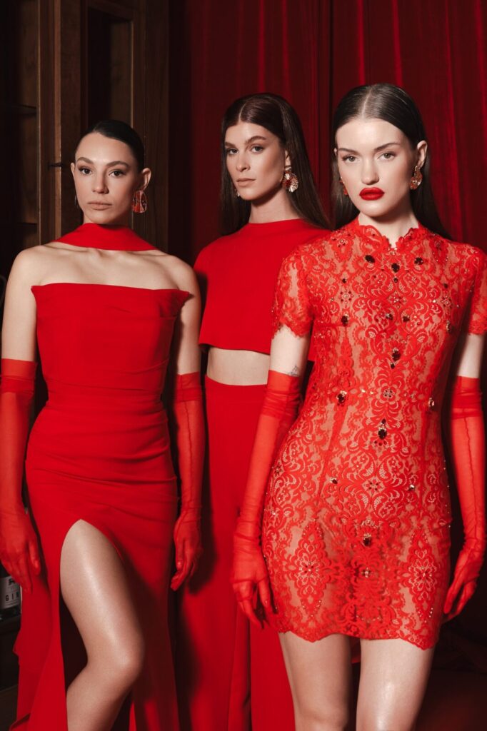 הקולקציה נצבעה כולה בגוון אדום עוצמתי, אשר יצר נוכחות דרמטית ובלתי מתפשרת על המסלול והדגיש את החיבור שבין אופנה עילית לבין יוקרה אירופית מסורתית המהווה מחווה לאסתטיקה של יוקרה אירופית קלאסית.