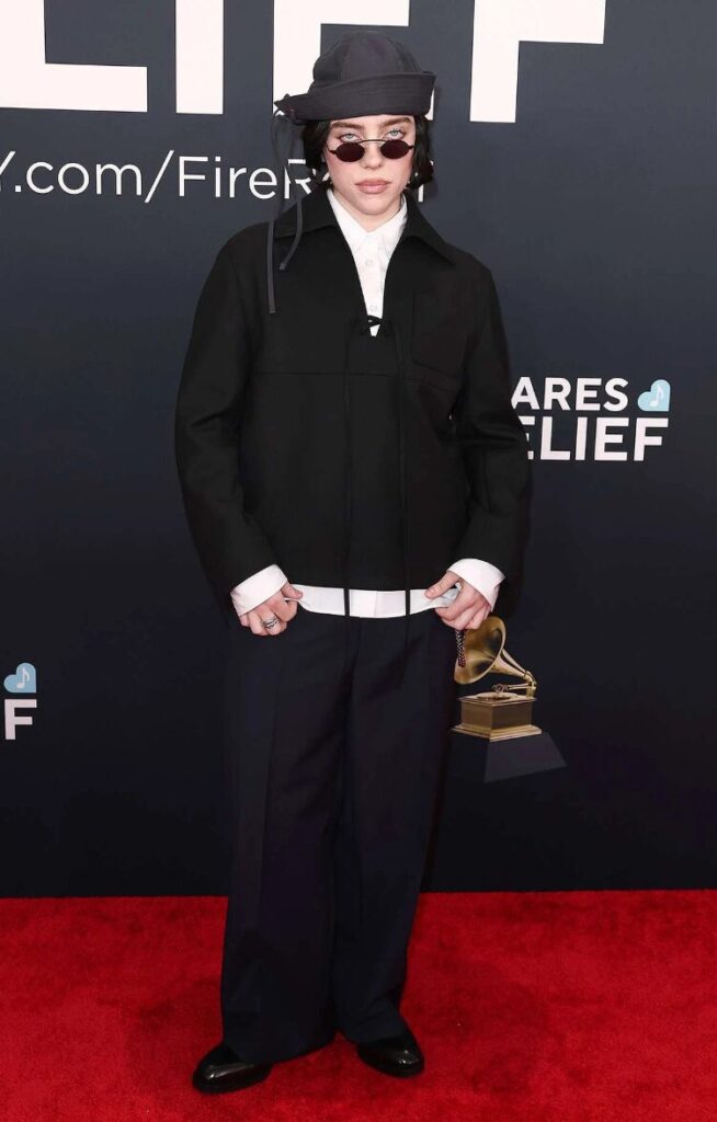 בילי אייליש המזוהה עם סגנון האוברסייז, בחרה הפעם בחליפת מלחים שחורה מבית פראדה. החליפה כללה ז’קט ארוך עם כפתורים מוזהבים ומכנסיים רחבים, שהעניקו לה מראה ימי ונועז. היא השלימה את ההופעה עם כובע מלחים ונעלי פלטפורמה שחורות.