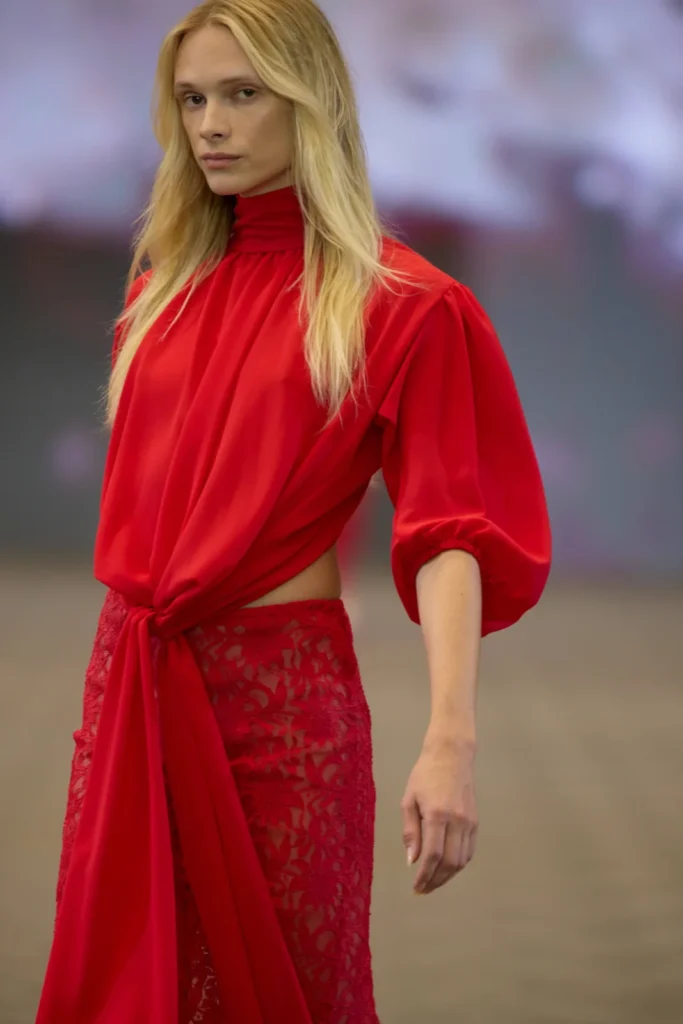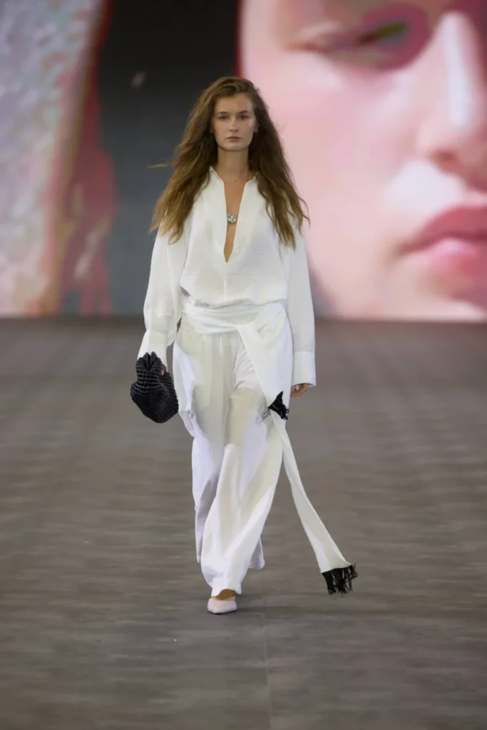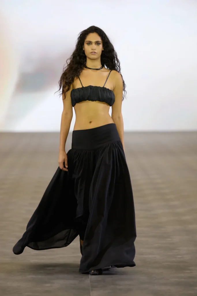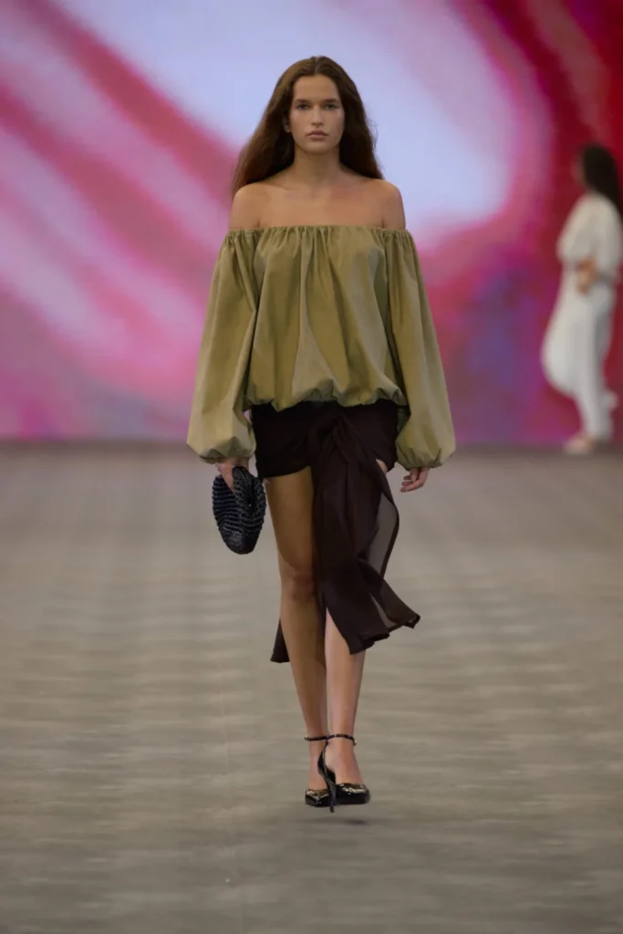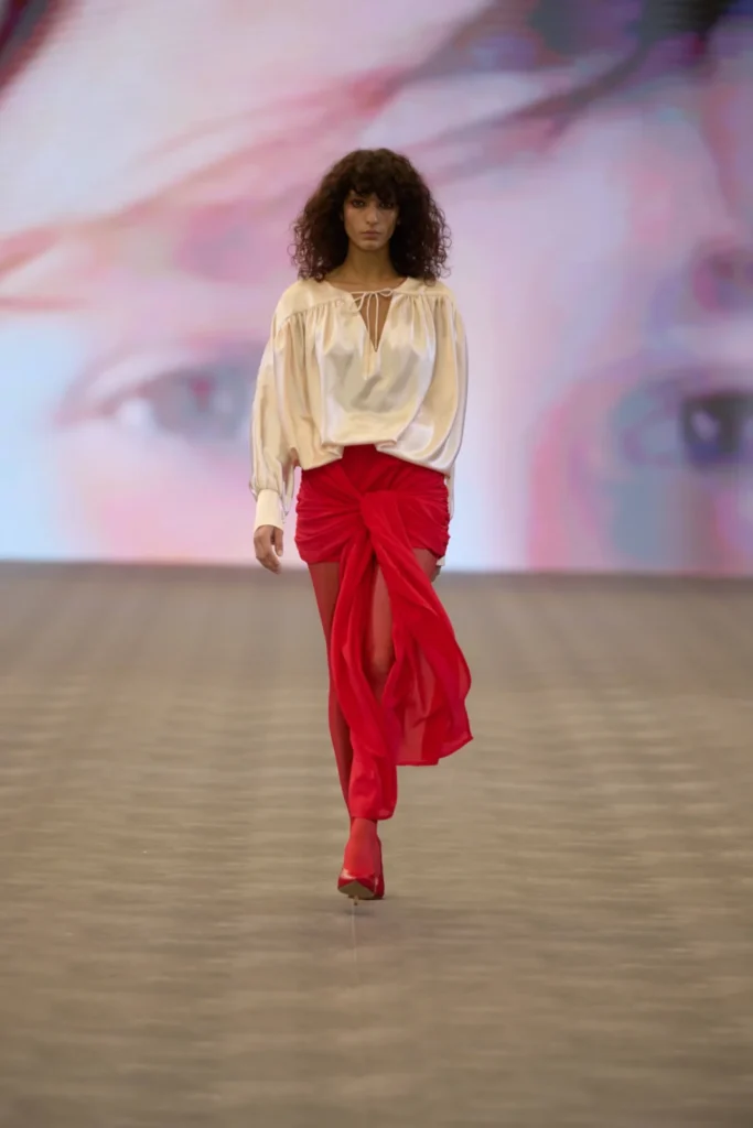 הגזרות בוחנות נפחים משתנים ותנועה, לצד נשיות במיטבה: מכנסי בלון, שרוולים תפוחים, חולצות עם גב פתוח, חצאיות פרח רחבות לצד חצאיות שקופות ועדינות, קשירות עוטפות שמזכירות צעיף ומעילי טרנץ’ בגזרה רפויה שמאזנים נשיות עם נוכחות עוצמתית. כל פריט נושא את החותם המדויק של המעצבת, משחק מושכל בין מה שמחשוף ומה שנשמר, בין רכות לכוח, בין פרטיות לנוכחות במסלול.