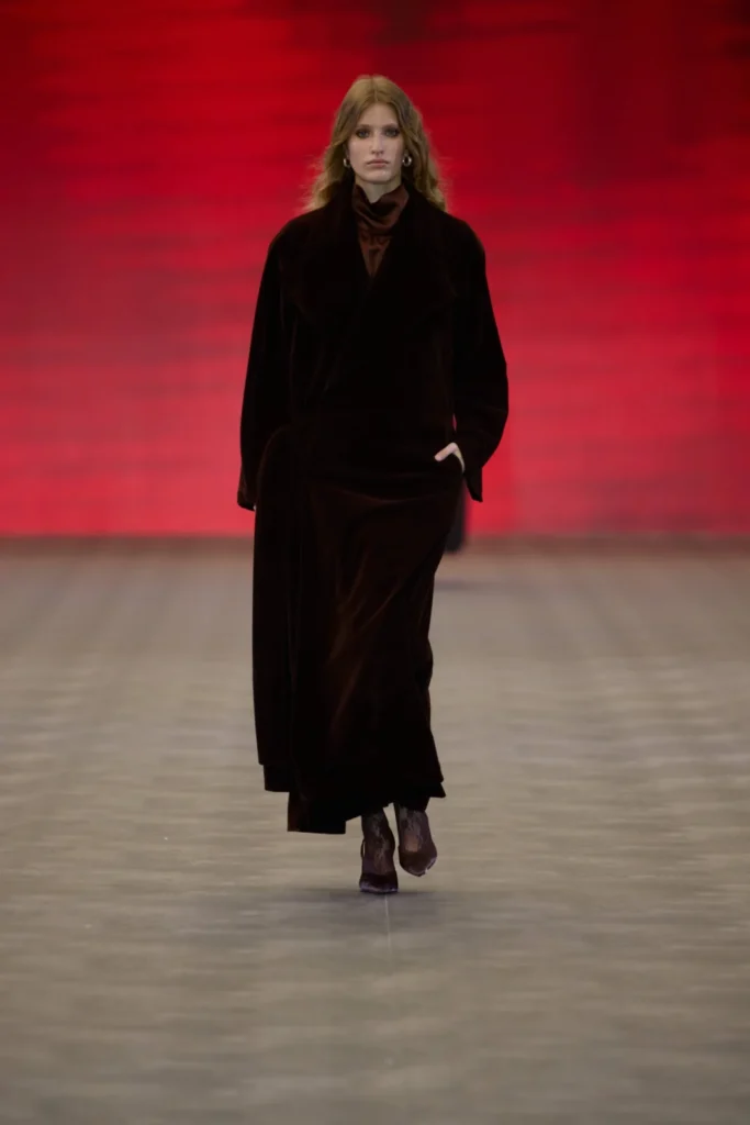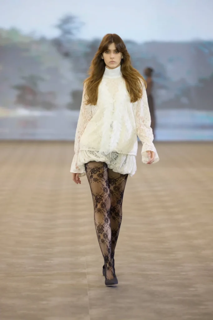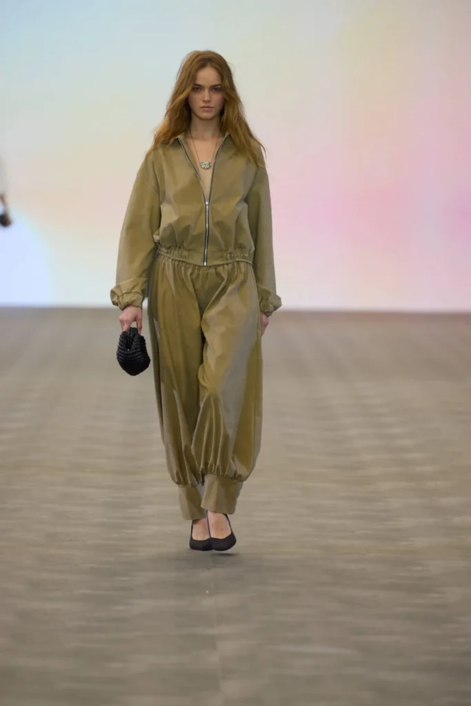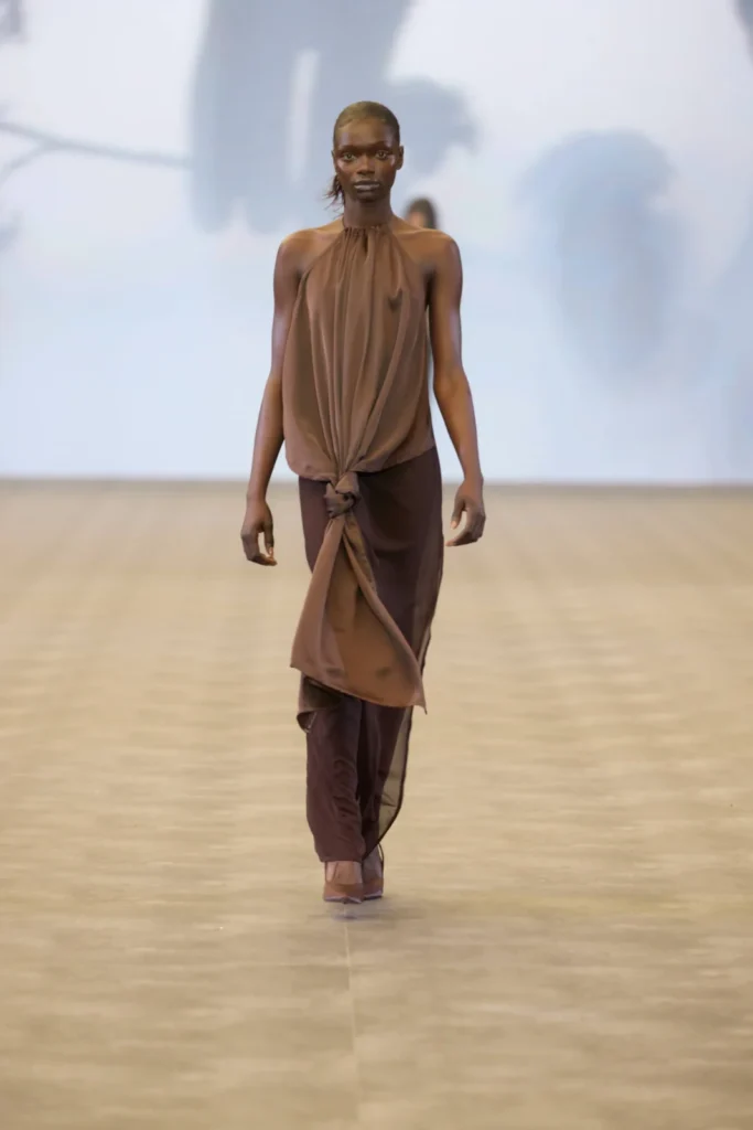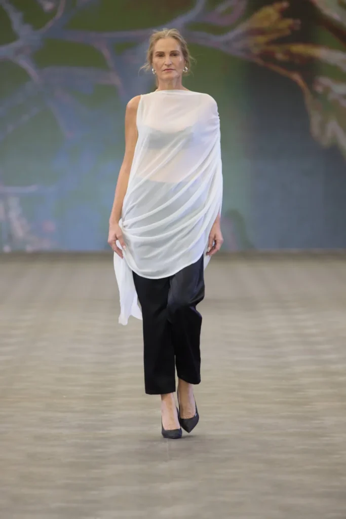 הגזרות בוחנות נפחים משתנים ותנועה, לצד נשיות במיטבה: מכנסי בלון, שרוולים תפוחים, חולצות עם גב פתוח, חצאיות פרח רחבות לצד חצאיות שקופות ועדינות, קשירות עוטפות שמזכירות צעיף ומעילי טרנץ’ בגזרה רפויה שמאזנים נשיות עם נוכחות עוצמתית. כל פריט נושא את החותם המדויק של המעצבת, משחק מושכל בין מה שמחשוף ומה שנשמר, בין רכות לכוח, בין פרטיות לנוכחות במסלול.
