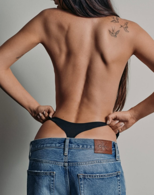 בכל פריים היא מופיעה בפריט אחד בלבד, בין אם היא לבושה בג’ינס בלבד כשהיא נשענת על חלון, או שרועה על כיסא בריכה ועל ספה במינימליזם מוחלט. התמונות שבהן היא לובשת רק את תחתוני הלוגו האיקוניים כשהיא נשענת על שולחן ביליארד, משלבות בין נוסטלגיה של שנות התשעים לרעננות מודרנית וחשופה.