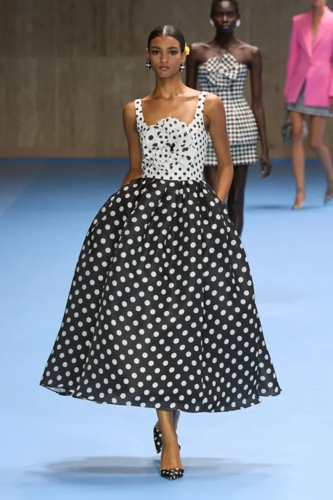 אף שההדפס מעורר מיד תחושת ילדותיות ורוך, הוא מצליח גם לשדר אלגנטיות ואפילו רומנטיקה בוגרת תלוי בגזרה, בצבע ובאופן שבו הוא משולב. זה בדיוק מה שעושים בתי האופנה המובילים בקיץ 2025: מוסקינו, קרולינה הררה, רודארטה ואלטוזארה שלפו מהארכיון את הדפוס האהוב והציגו אותו מחדש על המסלול – בגזרות חדות, צבעים מפתיעים ולעיתים גם בהגזמה מודעת.