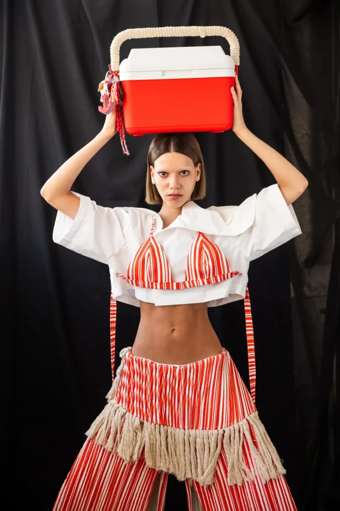 איך אורזים חיים בתיק גב? אחרי שפונתה עם משפחתה מהצפון בתחילת המלחמה, כץ יוצאת למסע (ליטרלי) ויוצרת קולקציה שמחפשת רגע של בית בתוך תנועה מתמדת. היא חורזת פונקציונליות עם אבסורד ומשלבת בחוכמה חומרים פלסטיים וטבעיים, פרופורציות מעניינות והומור שחור.