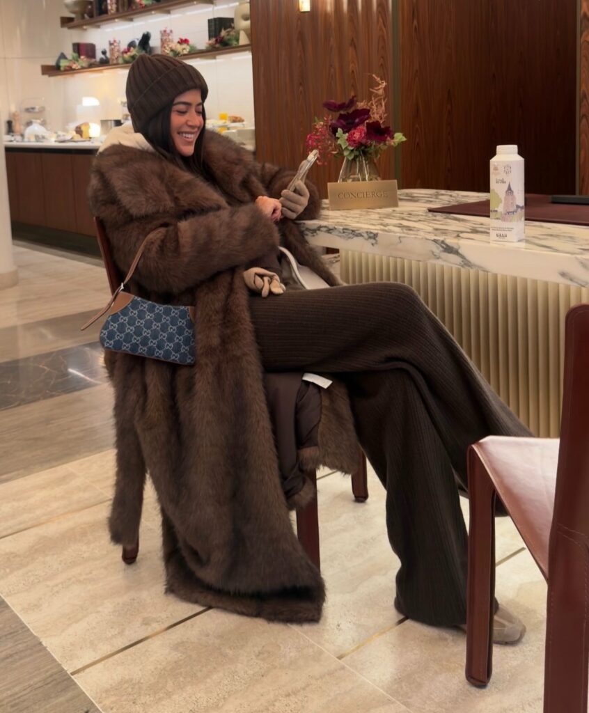 עוד לוק מעולה של דורין שממשיכה להראות לנו שפרווה היא פריט מאסט לחופשת חורף באירופה בשמלה חומה קצרה בשילוב מעיל פרווה חום שיוצר מראה חמים, נשי ומדויק.