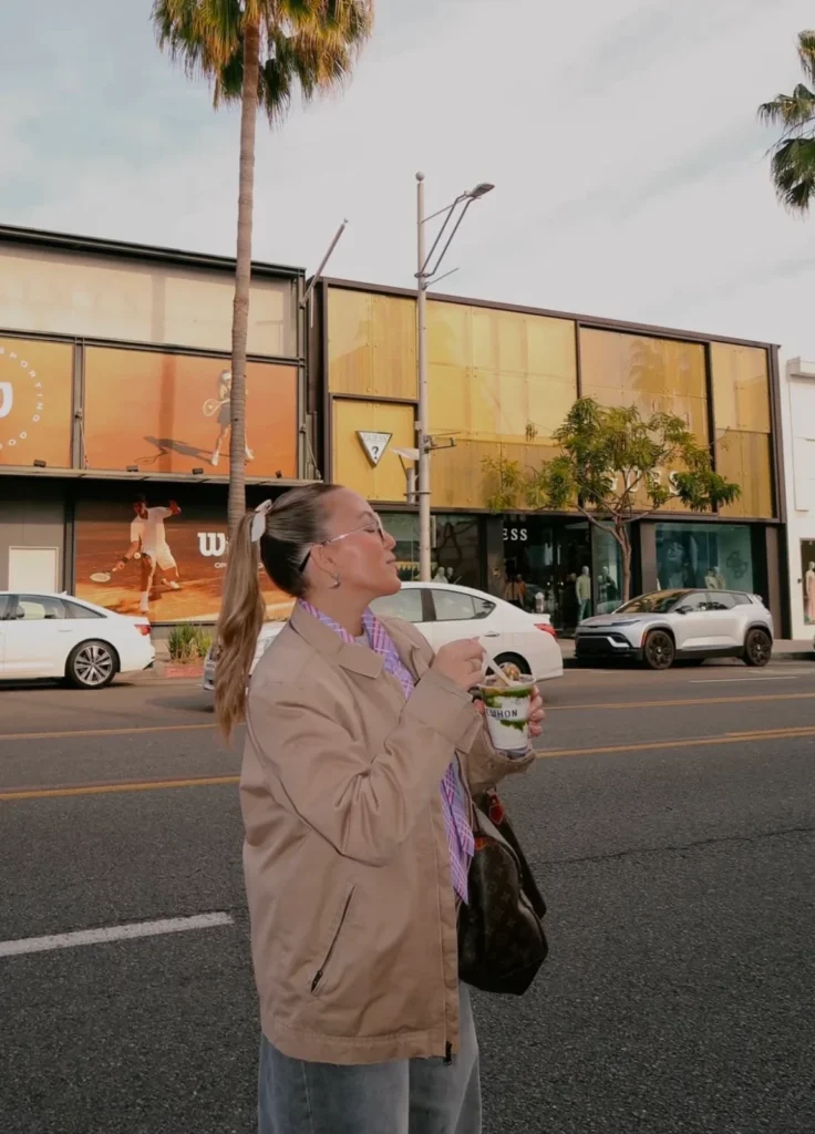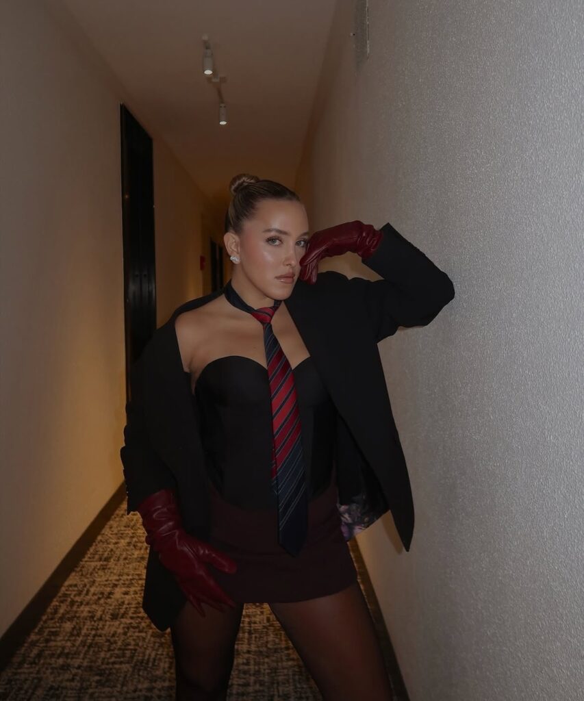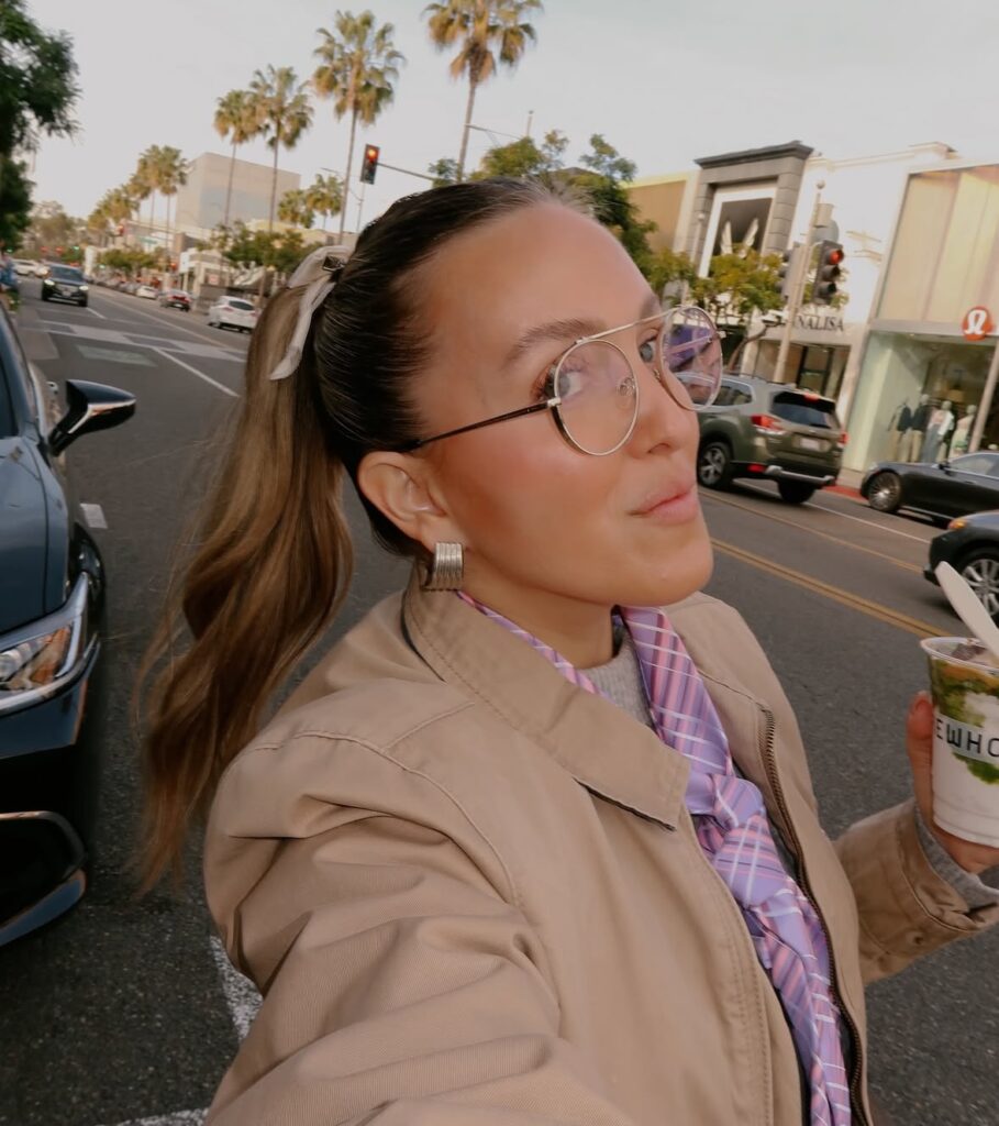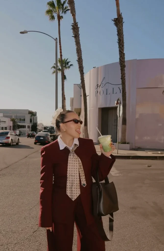 היא המשיכה עם הקו המחויט והציגה חליפה בורדו מחמיאה, חולצה מכופתרת ועניבה מודפסת בסגנון רטרו, משקפי שמש קטנים ואסוף מוקפד עם סקרנצ’י לבן. ביד מחזיקה מאצ’ה קריר ובווייב פאשן במיטבו.