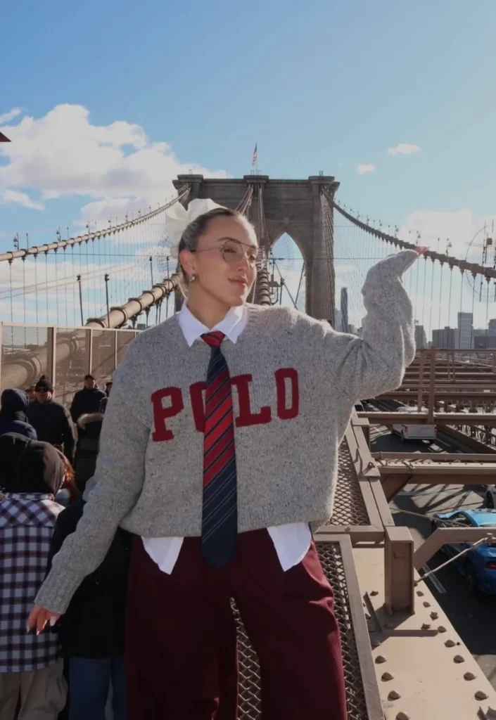 ואם כבר לוקים, אין ספק שזיקרי היא הקארי בראדשו המקומית. יש לה חיבה לפריטים מחויטים, שילובים לא שגרתיים והמון תשומת לב לפרטים הקטנים. כך למשל, בניו יורק היא הצטלמה בלוק קולג’י עם סוודר אפור של “POLO”, חולצה מכופתרת לבנה, עניבה פסים קלאסית בגווני כחול-אדום ומכנסיים בגזרה רחבה בצבע בורדו. הסרט הלבן בשיער הוסיף טאץ’ אלגנטי, ויחד עם הנוף של גשר ברוקלין – זה היה רגע של אופנה טהורה.