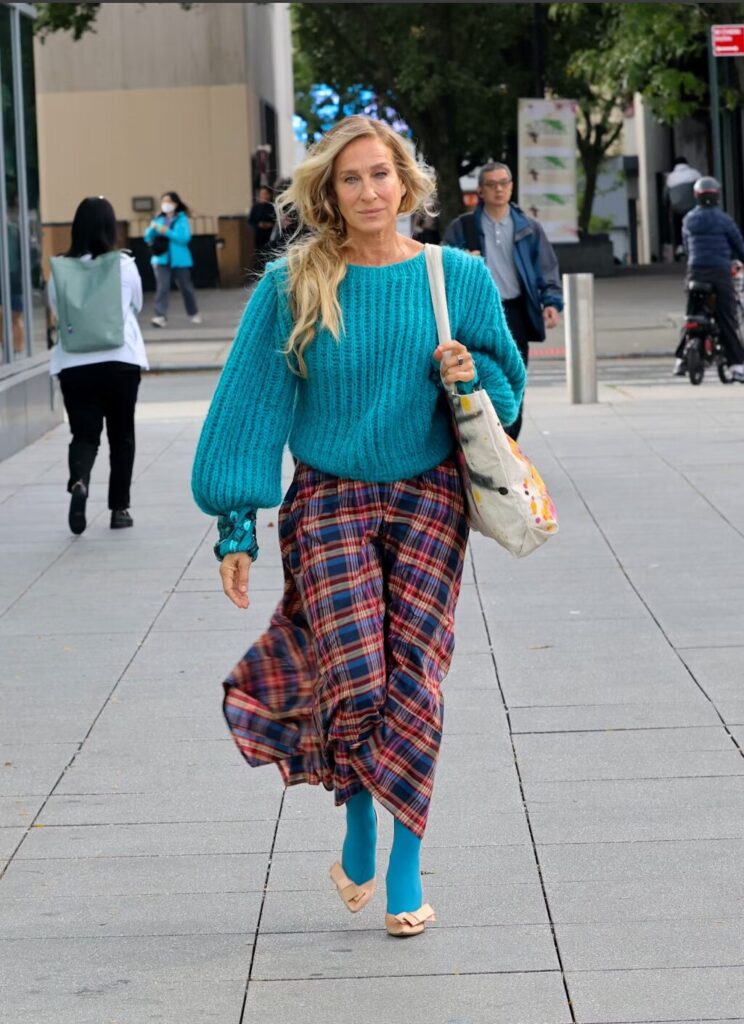 מעניין במיוחד לראות כיצד המראה החדש מתכתב עם הופעותיה הקודמות בסדרה. מוקדם יותר החודש, פרקר נצפתה בסט כשהיא לובשת חצאית בהשראת שנות ה-80 מבית אולה ג’ונסון, משולבת עם סוודר סריג בכחול ניאון המעוטר בפייטים חגיגיים. הבחירה בגרביים תואמות הוסיפה עוד שכבה של תחכום למראה כולו.