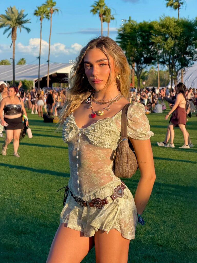הלוק הושלם עם מכנסיים רחבים בהדפס פרה חום-לבן, שהעניקו את הקריצה הפוטוגנית המושלמת לאווירת המערב הפרוע של קואצ’לה. עם חגורת מותן בעלת אלמנטים ממתכת, שרשראות ומשקפי שמש שקופים בצבע ענבר.