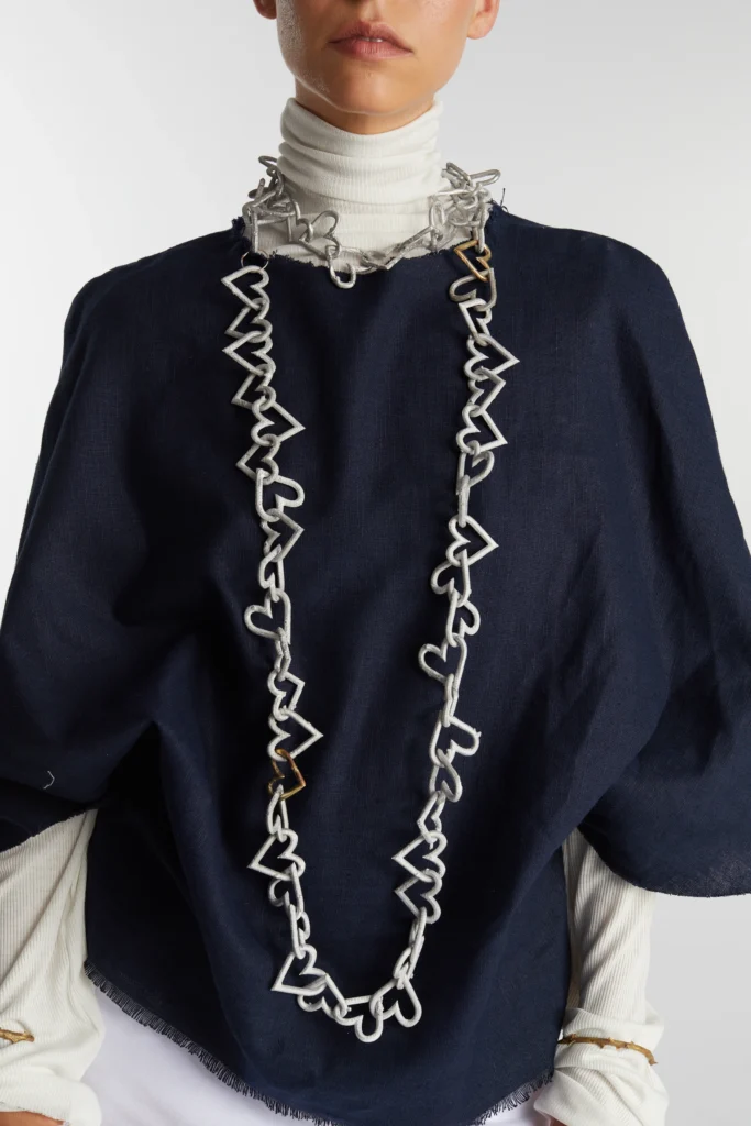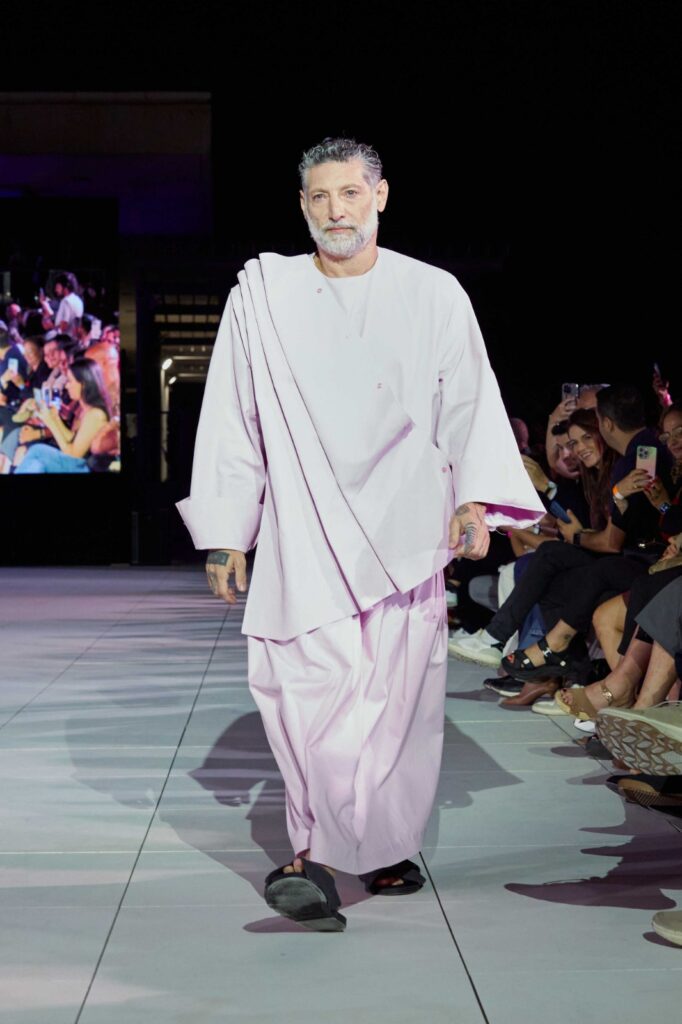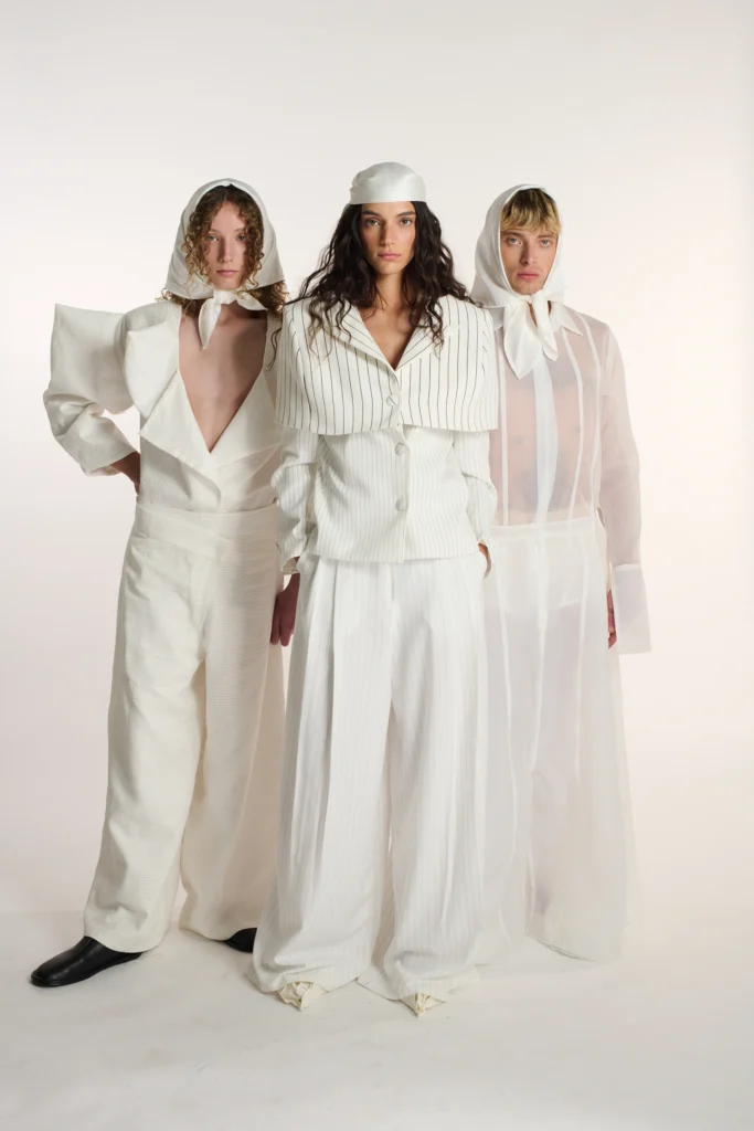 אחד הדגמים החזקים בקולקציה הוא אוברול בעל מכנסיים מתרחבים, שמעליו מונחת מעין מעטפת היוצאת מתוך השרוולים – ועל המסלול תפקדה ככיסוי ראש עשיר בחרוזים אדומים.