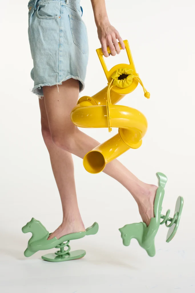 הפריטים החזקים בקולקציה הם בהחלט זוג נעליי נדנדת סוס בגווני ירוק ים ותיק מגלשה צהוב ובאופן מפתיע הקולקציה הוצגה על המסלול ורק מעצימה את הדגש של המחלקה לכך שכול נעל שנעשית במחלקה תהיה לבישה ואפשרית להליכה.