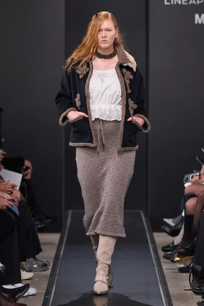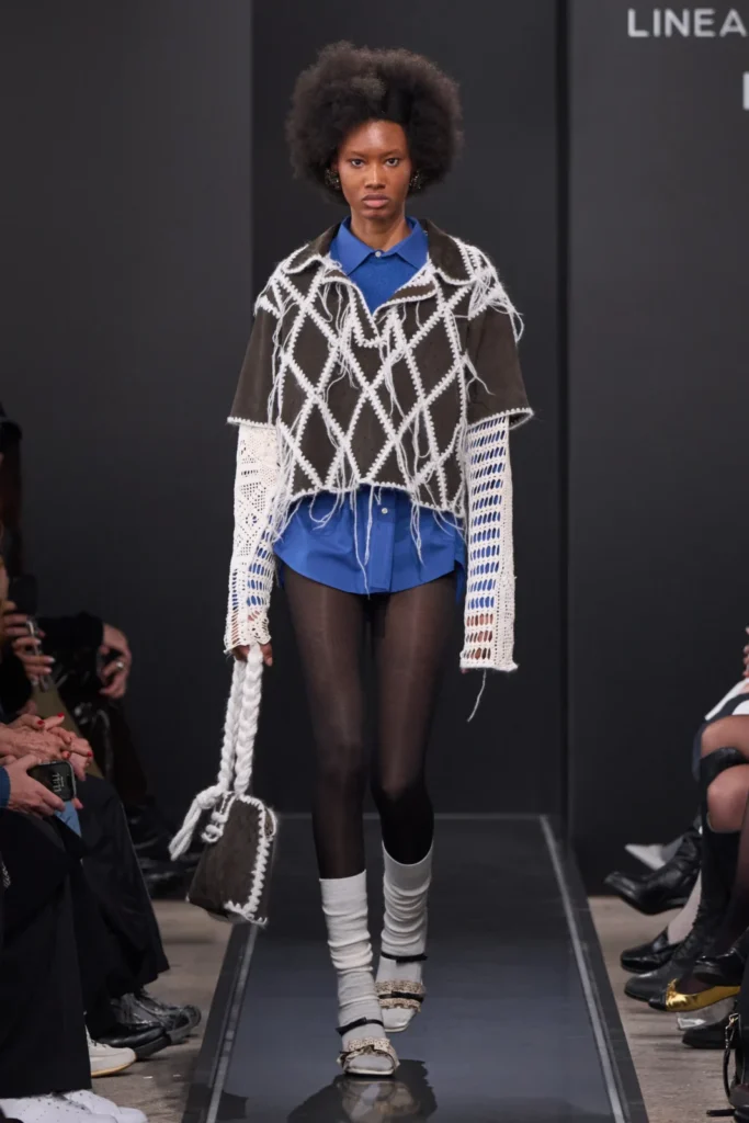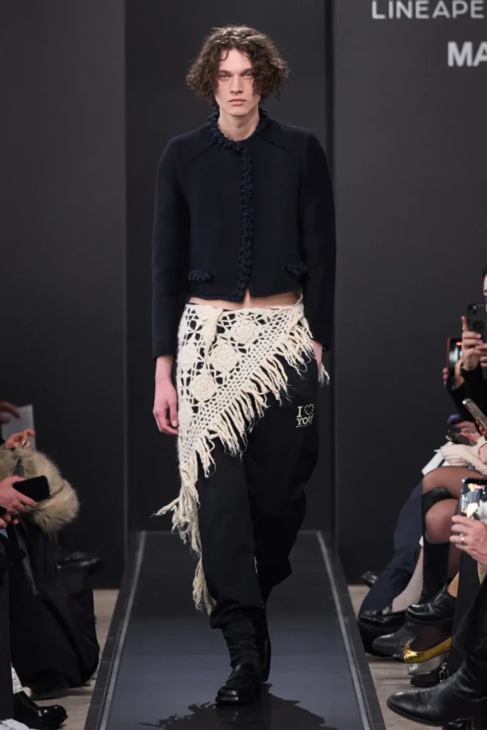 המסלול התמלא בסריגי קרושה עדינים בשילוב עם הדפסי פרחים ונופים חלומיים שמרגישים כמו זיכרון מתוק משנות השבעים שעבר התאמה לדור ה-Z. הוא משתמש בטכניקות ידניות כדי ליצור שמלות ומערכות לבוש שנראות כמעט אורגניות על הגוף תוך שמירה על גיוון אנושי יוצא דופן של הדוגמניות והדוגמנים על המסלול.