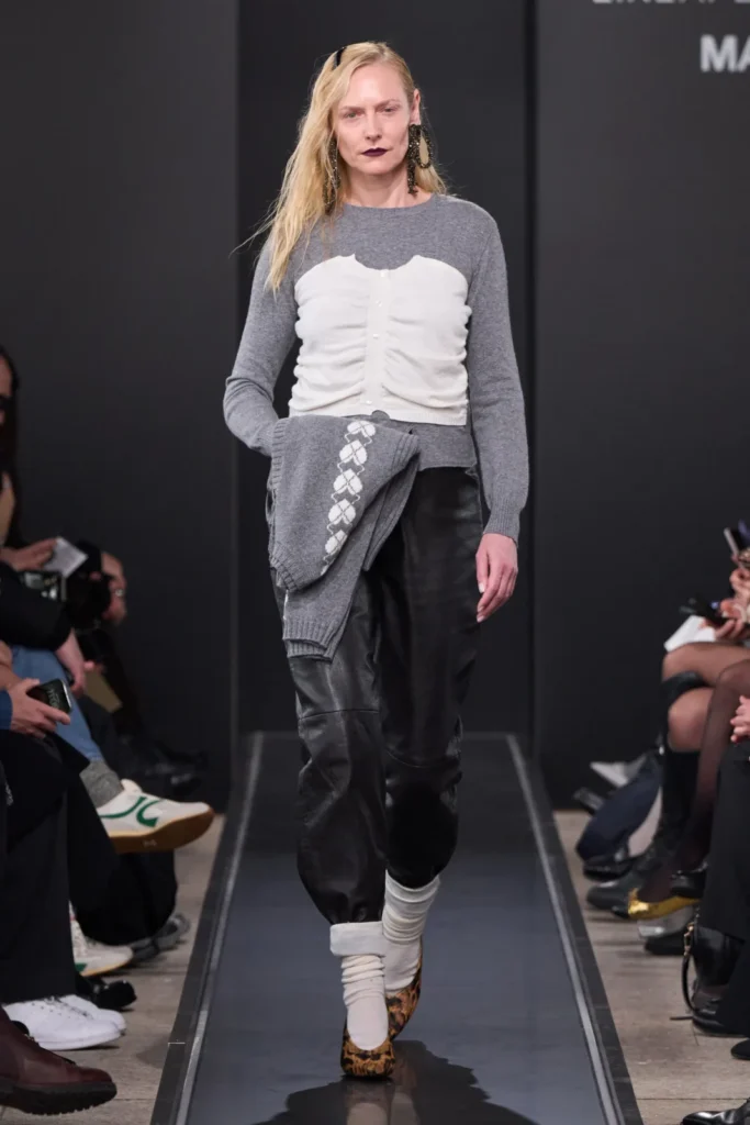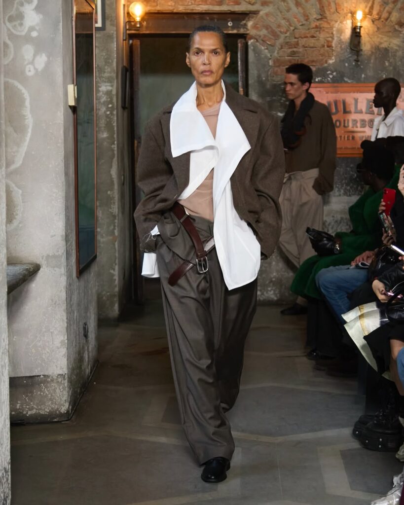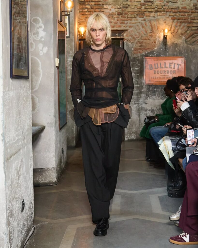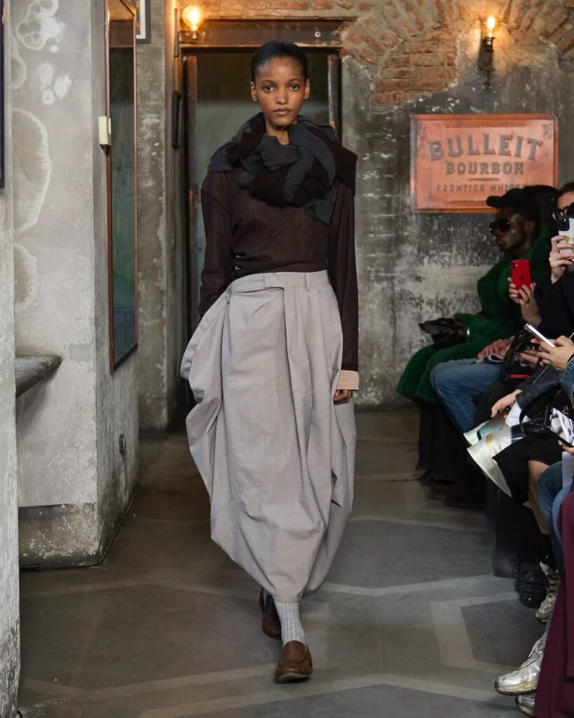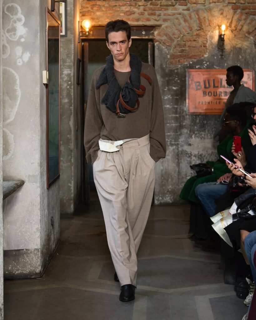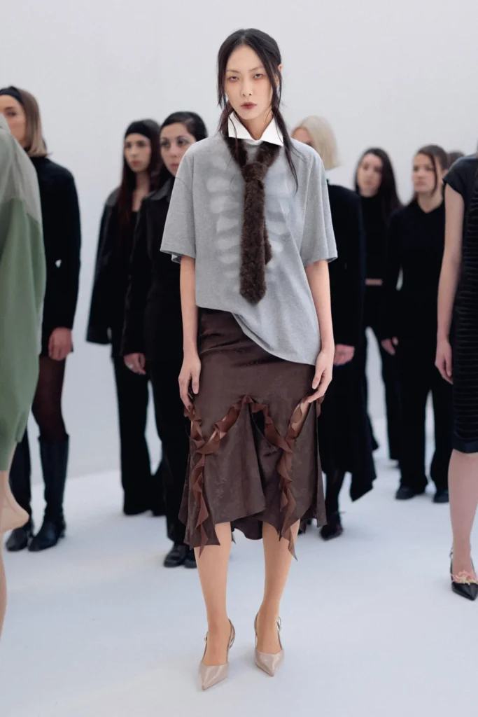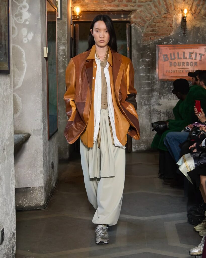 המותג השני שסימנו עבורכם הוא ACT N°1, שבקולקציה הנוכחית בחר להתרחק מהדרמה המוכרת לטובת חקירה מעמיקה של שכבות, נפחים וצבעוניות אדמתית. לוקה לין הציג מלאכת מחשבת של פאצ’וורק, עם ז’קטים מרהיבים המורכבים מטלאי עור בגווני חום ושוקולד, שנלבשו מעל חולצות כפתורים לבנות ואוברסייזיות. הצלליות היו רחבות ופיסוליות, כשמכנסיים מחויטים נשפכו על הרצפה ולוו באלמנטים של קשירות בד סביב המותניים והצוואר שהעניקו מראה נונשלנטי אך מוקפד.