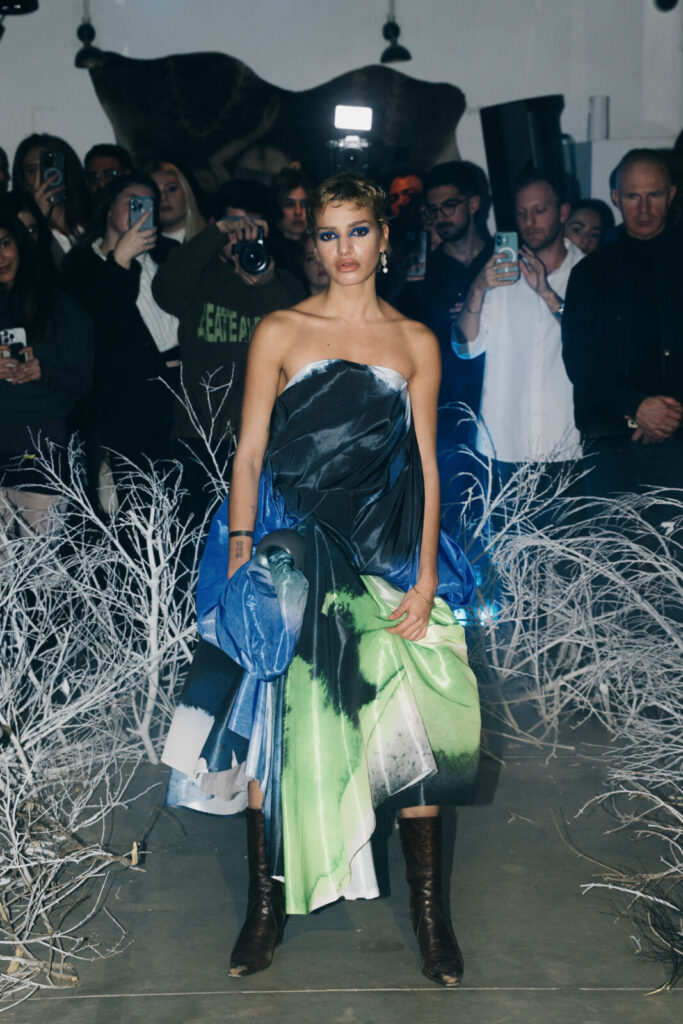 הזוכה השנה בתחרות של המיזם היא המעצבת הצעירה מאש גלידר. הדגם שבחרה להציג הוא יצירה קונספטואלית ומרשימה, עם אלמנטים פיסוליים ואוונגרדיים. השמלה בולטת בצללית שעון חול מוקצנת, כשהכתפיים הגבוהות והזוויתיות משדרות נוכחות ארכיטקטונית והירכיים המורחבות יוצרות נפח דו-ממדי כמעט פיסולי.