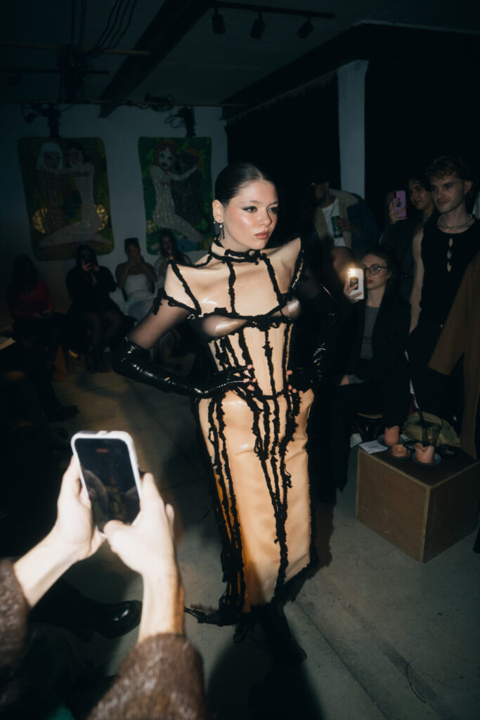 הבד העיקרי בגוון גוף שקוף/ניודי מעניק תחושה של “עור שני”, בעוד הקווים השחורים הפרומים יוצרים ניגודיות דרמטית ומדגישים את הקימורים של הגוף והבגד. החלק העליון משולב עם אלמנט דמוי מחוך, הצווארון גבוה ומחובר לרצועות שחורות היוצרות אפקט של רתמה והסיום התחתון משמר תחושת פריכות אורגנית ומרקם בלתי צפוי.